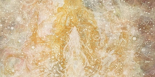 実は、この絵を描きはじめたときは、最初はいつも優しくお迎えしてくださる印象から、柔らかい色使いが先行していました。女性性を強く感じられていましたので、柔らかいイメージで描き始めていました。それが描き進めていくうちに、その柔らかさから、力強い状態へと変化していきました。長年直感で絵を描いているのですが、未だにイメージを先行させてしまうことがたまにあります。しかし、最終的には、意識の向きをしっかりと調えることにより、イメージの方向で描くことはなくなり、必要な形となって表われてきます。逆にそのことがあって、描けているとの安心につながることがあります。