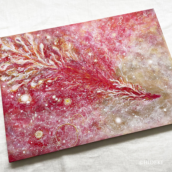 赤やローズピンク、金色の煌めきをまとって描かれた